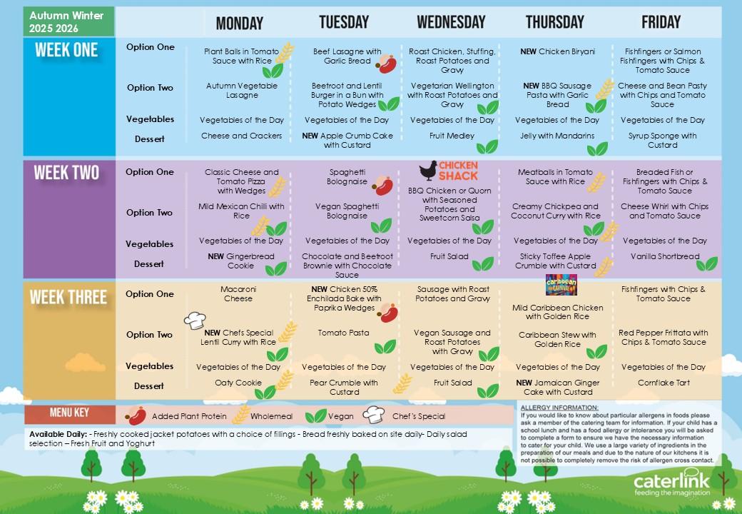 The school offers hot school lunches to all pupils. These are supplied by our catering provider, Caterlink. The cost for a two-course lunch, from September 2025, is £2.75 per day for Key Stage 2 pupils. Pupils in Reception class, Year 1 and Year 2 are not charged for school meals.